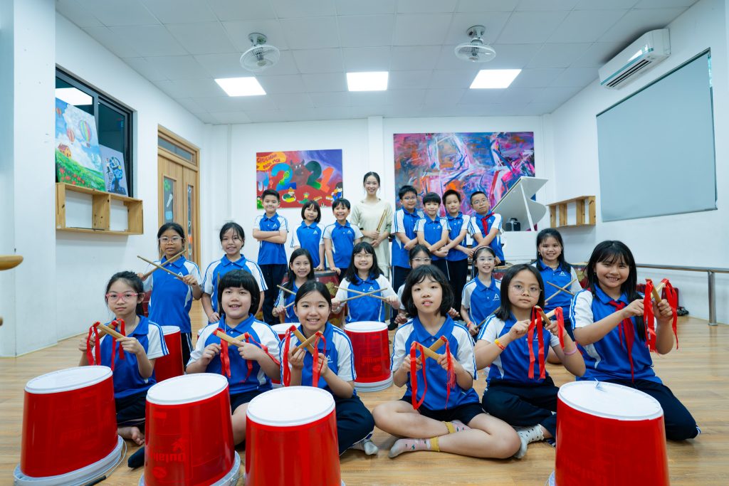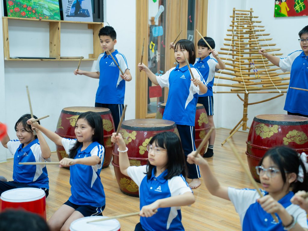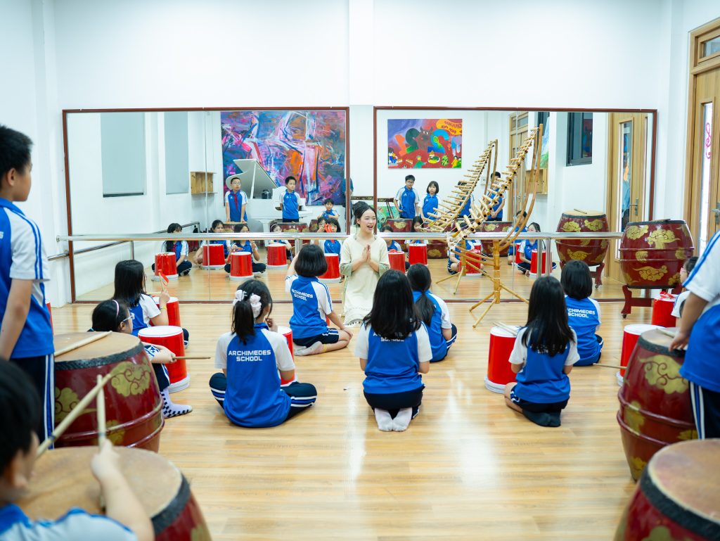 Trường Tiểu học, THCS & THPT Archimedes Đông Anh chính thức đưa Trống dân tộc vào chương trình học Âm nhạc cấp tiểu học, bắt đầu triển khai từ Khối 4. Đây là một trong những nội dung trải nghiệm nghệ thuật đặc trưng tại Archimedes Dong Anh School, nơi học sinh không chỉ học nhạc mà còn khám phá chiều sâu văn hóa phía sau từng nhịp điệu.