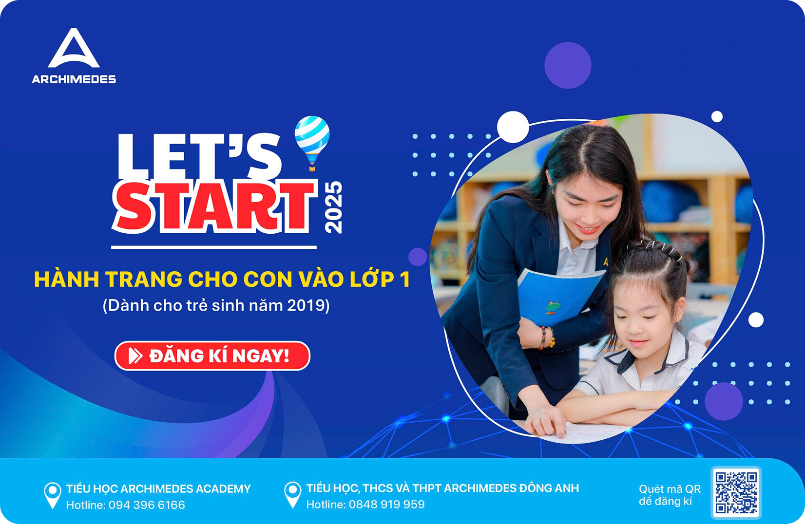 - Archimedes School giới thiệu tới quý CMHS chương trình LET’S START 2025 – HÀNH TRANG CHO CON VÀO LỚP 1 với nhiều hoạt động trải nghiệm thú vị, giúp trẻ chuẩn bị kĩ năng thích nghi, hòa nhập, khả năng tư duy, ngôn ngữ và những kĩ năng căn bản… cùng trẻ tự tin bước vào một cấp học mới.